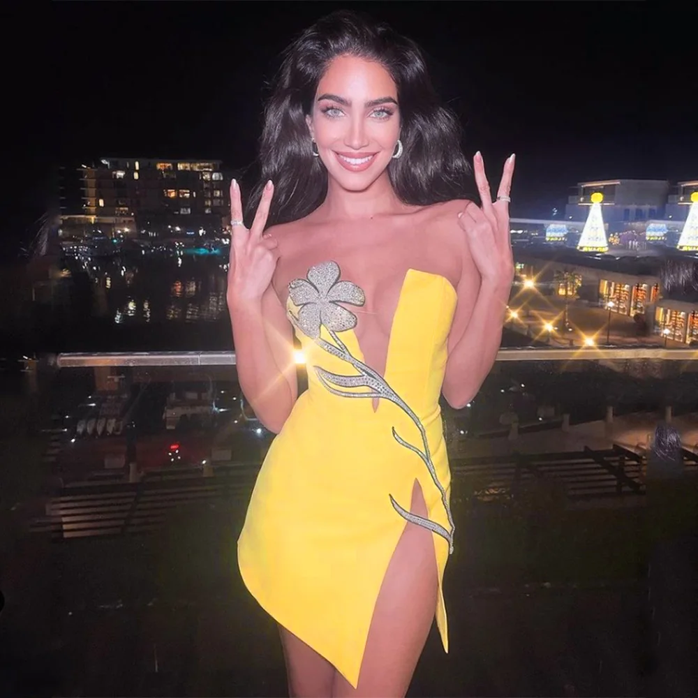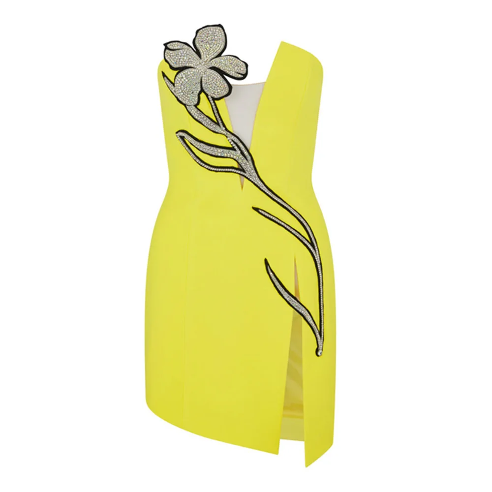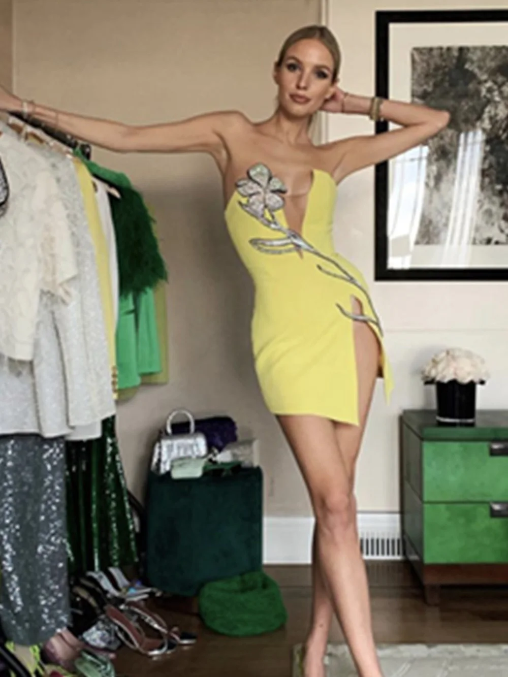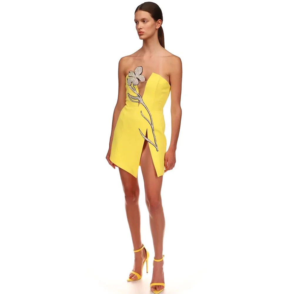 2022 New Yellow Strapless Bandage Mini Dress Women White Sexy Mesh Diamond Bodycon Split Dress Fashion Party Nightclub Clothing