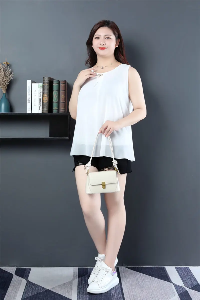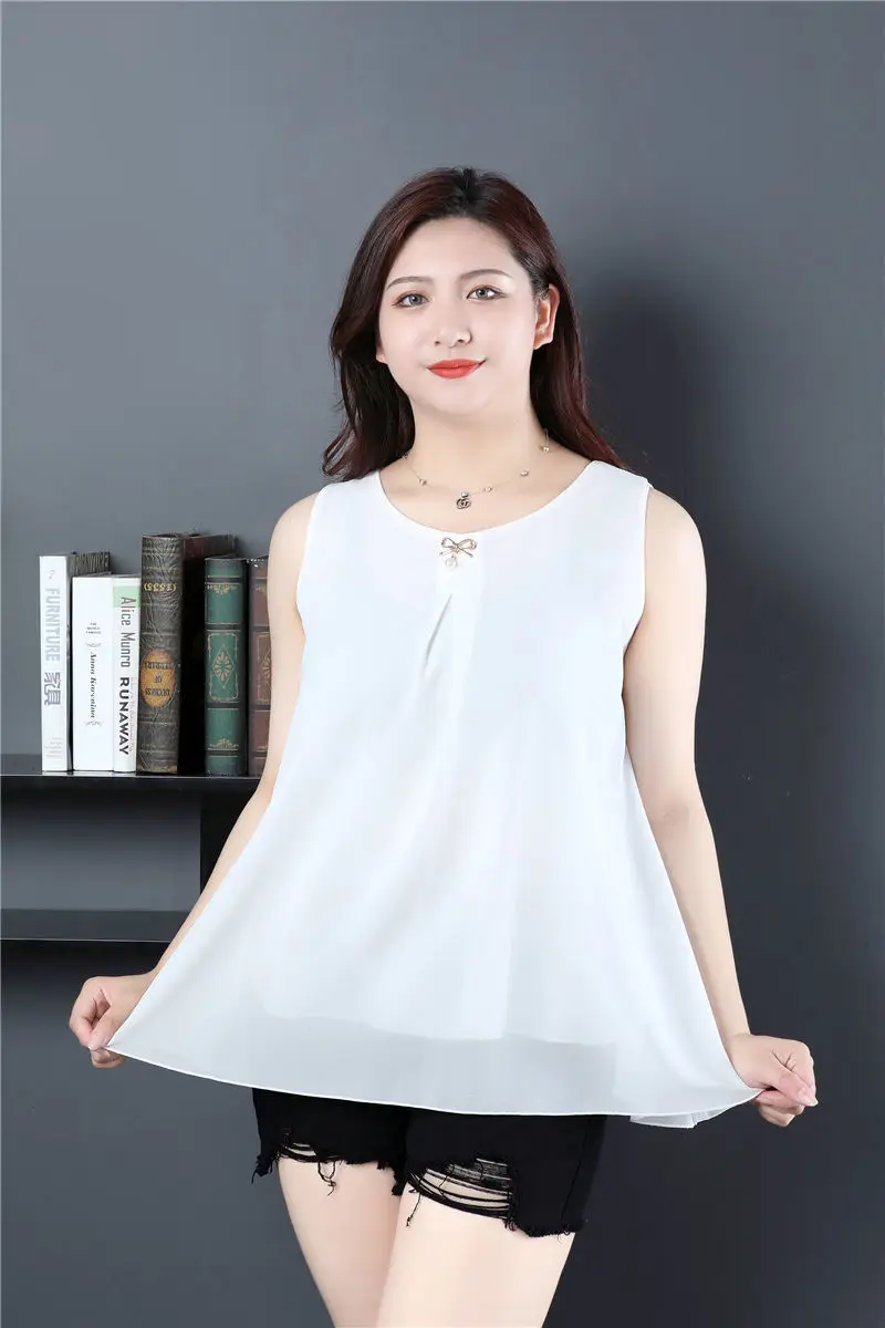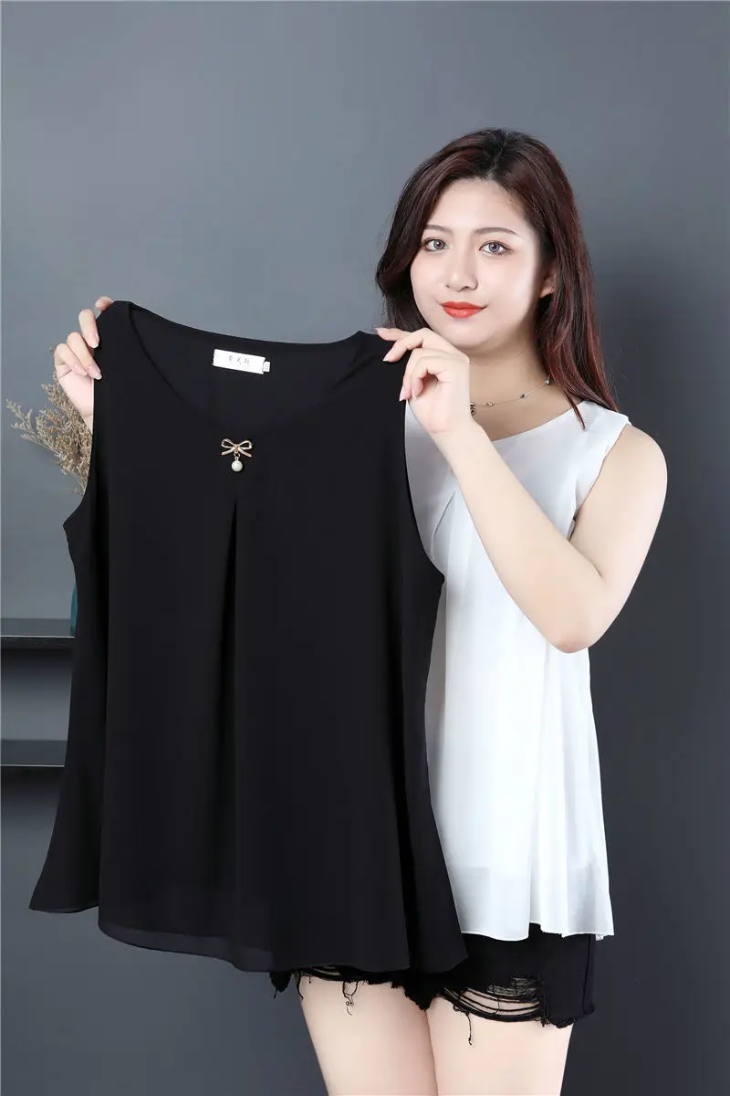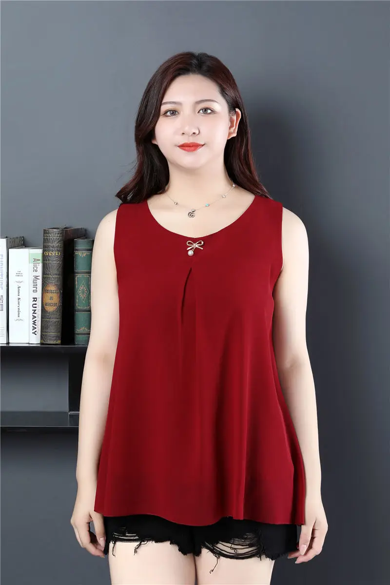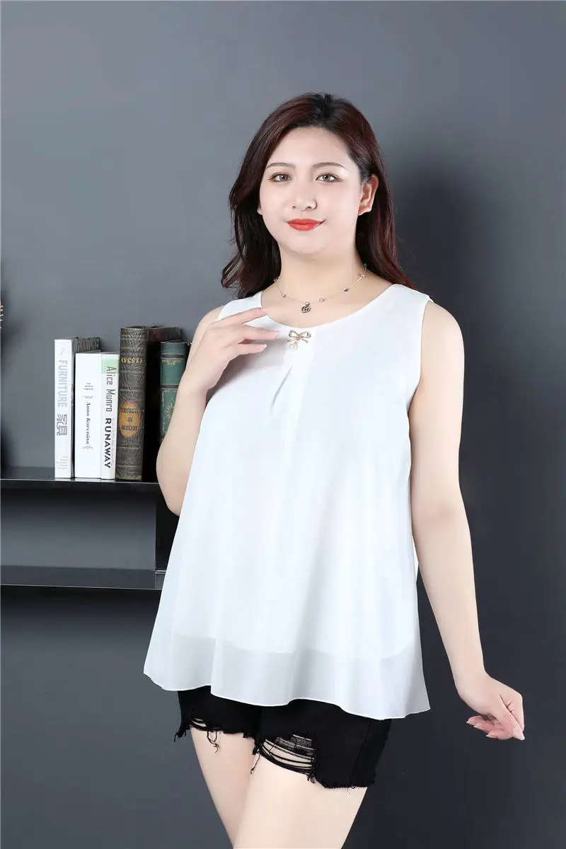 Obesity Women Chiffon Shirt 2022 New Summer Sleeveless O-neck Blouse Casual Solid White/Red Loose Oversized Female Tops