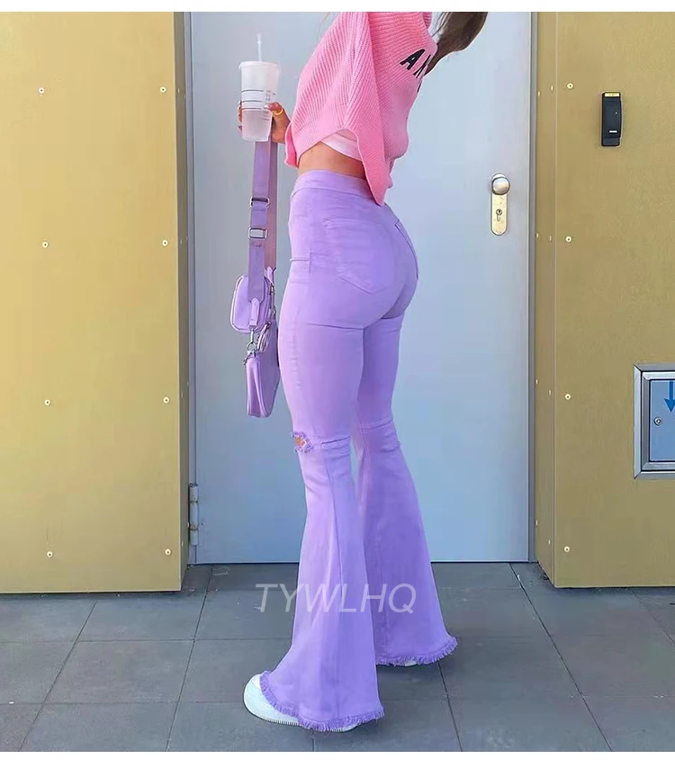 Streetwear Flared Jeans - High Waist Fashion Purple Stretch